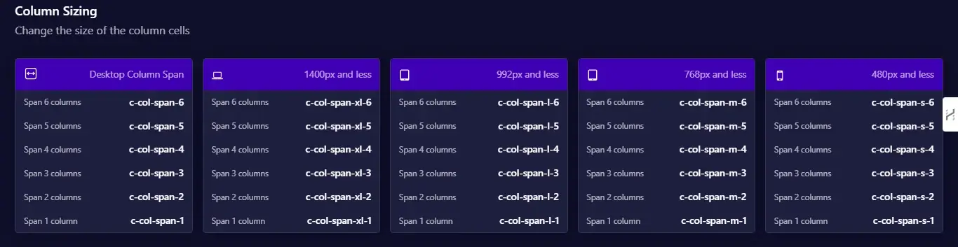 Each variable represents a different column span, with values defined in the repeat() format for grid layouts. You can adjust these in your grid settings.v